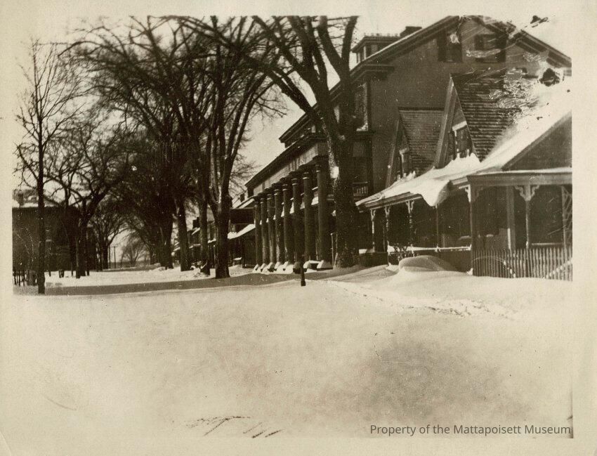 B&W photograph of Water Street in winter. Purrington Hall at left, Resolved W. Bolle's house at right, with Mattapoisett House behind.Collection