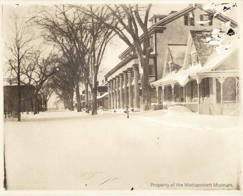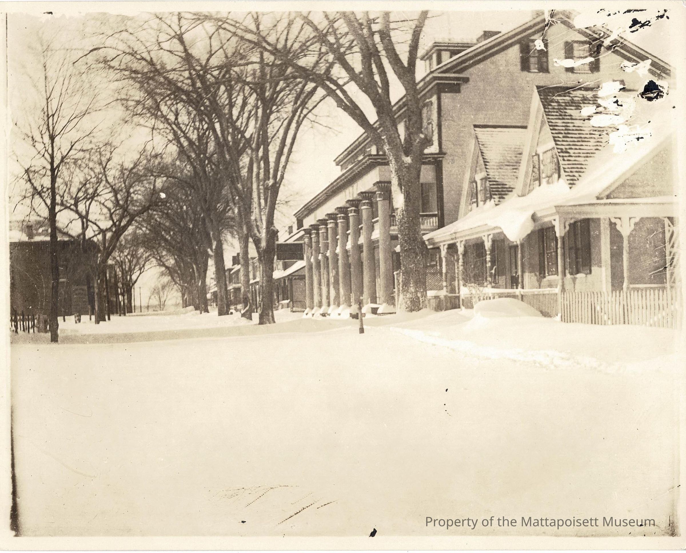 B&W photograph of Water Street in winter. Purrington Hall at left, Resolved W. Bolle's house at right, with Mattapoisett House behind.Collection