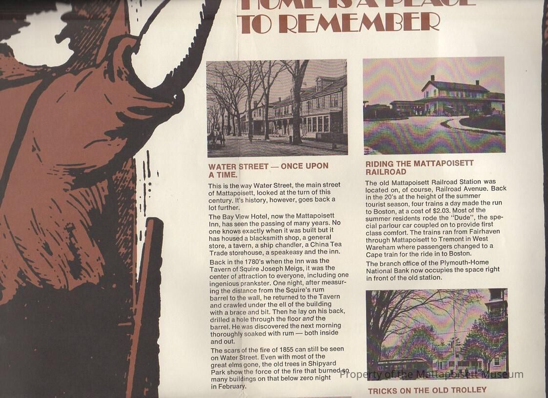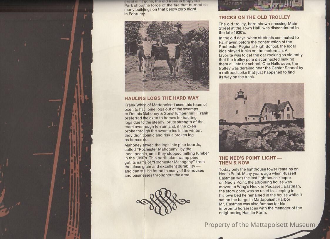 Article "Home is a Place to Remember", short pieces "Water Street - Once Upon a Time"; "Riding the Mattapoisett Railroad"; "Tricks on the Old Trolley"; "Hauling Logs the Hard Way".Collection
