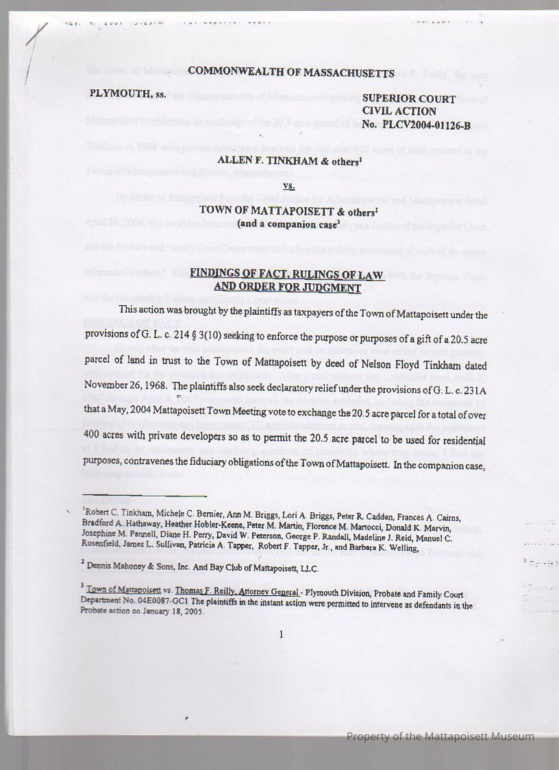 Findings of Fact, Rulings of Law and Order for Judgement, Allen F. Thinkham & Others vs. Town of Mattapoisett.Collection