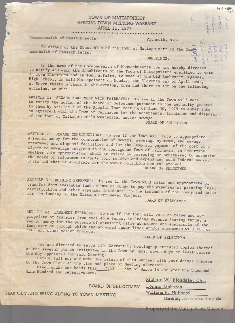 Town of Mattapoisett Special Town Meeting Warrant.Collection