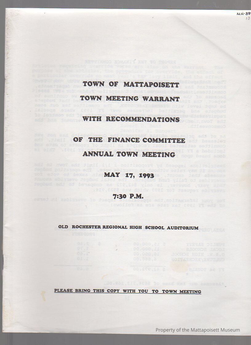 Town of Mattapoisett Town Meeting Warrant, with recommendations of the finance committee Annual Town Meeting. Old Rochester Regional High School Auditorium.Collection
