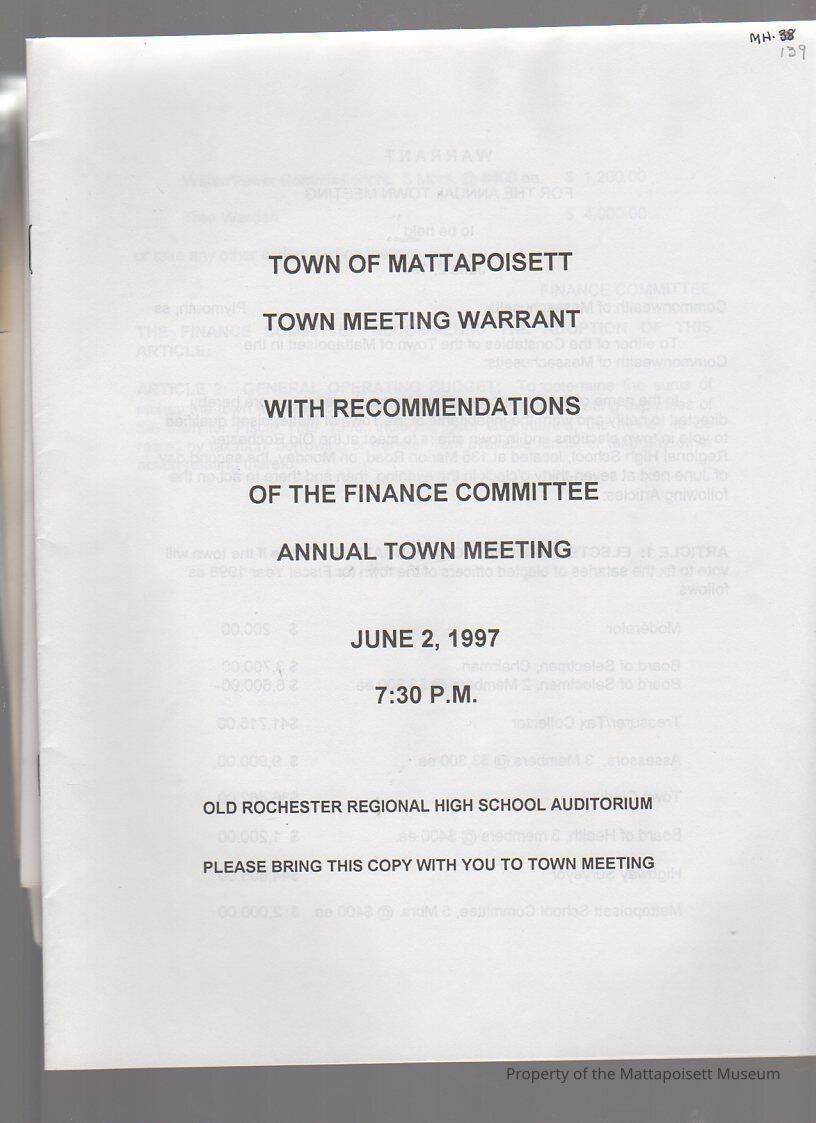 Town of Mattapoisett Town Meeting Warrant, with recommendations of the finance committee Annual Town Meeting. Old Rochester Regional High School Auditorium.Collection