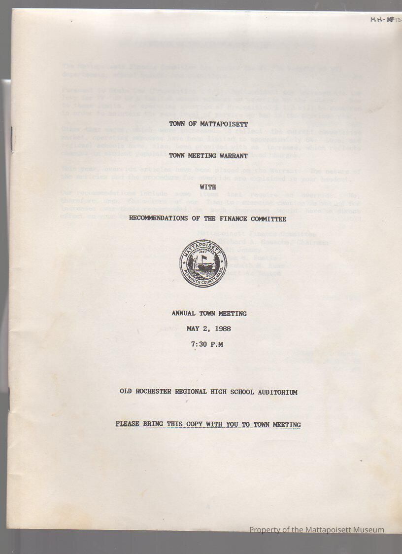Town of Mattapoisett Town Meeting Warrant, with recommendations of the finance committee Annual Town Meeting. Old Rochester Regional High School Auditorium.Collection