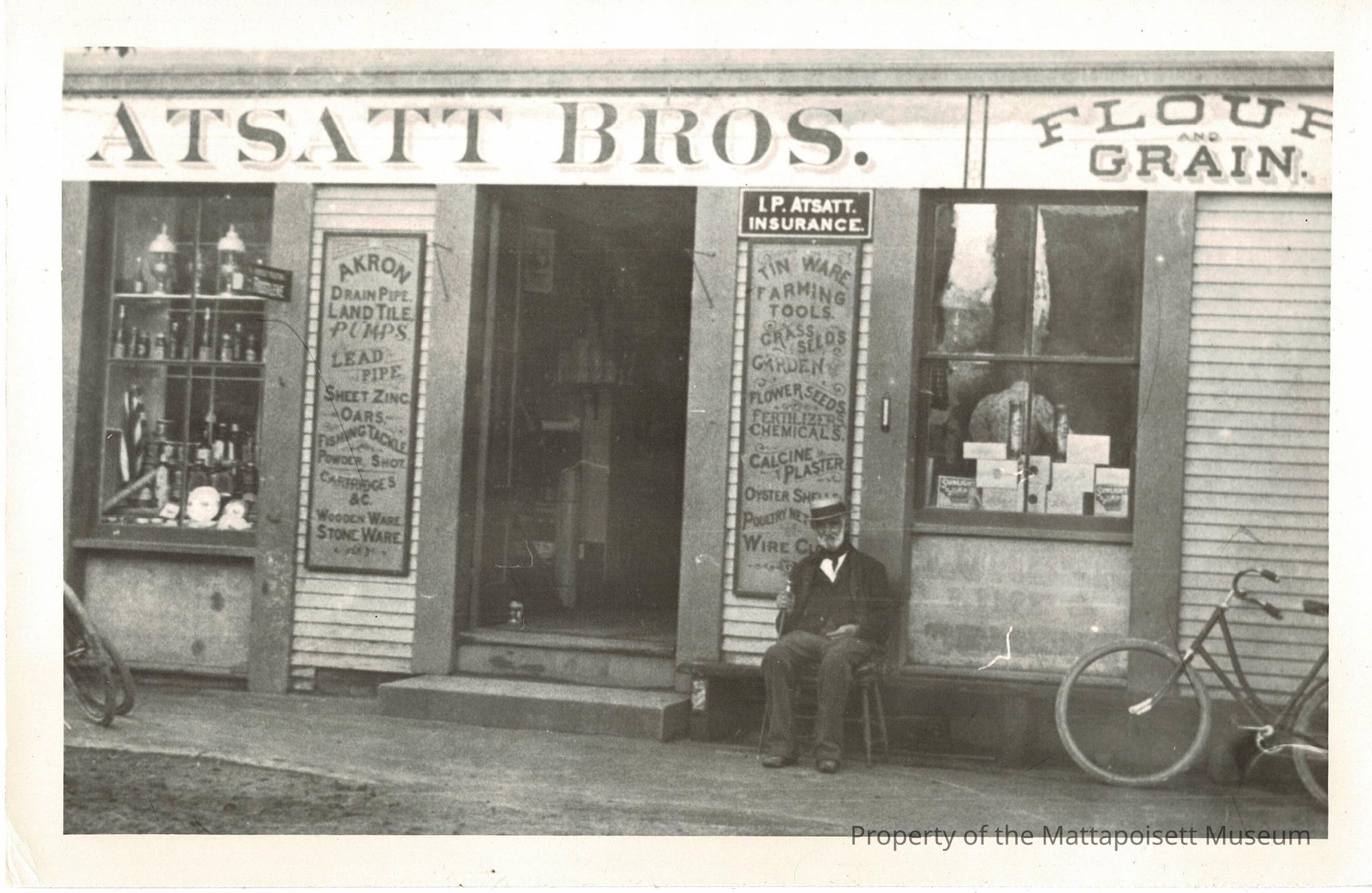 B&W photograph of the Atsatt Bros. store on Water Street, owner John T. Atsatt sitting in front.Collection