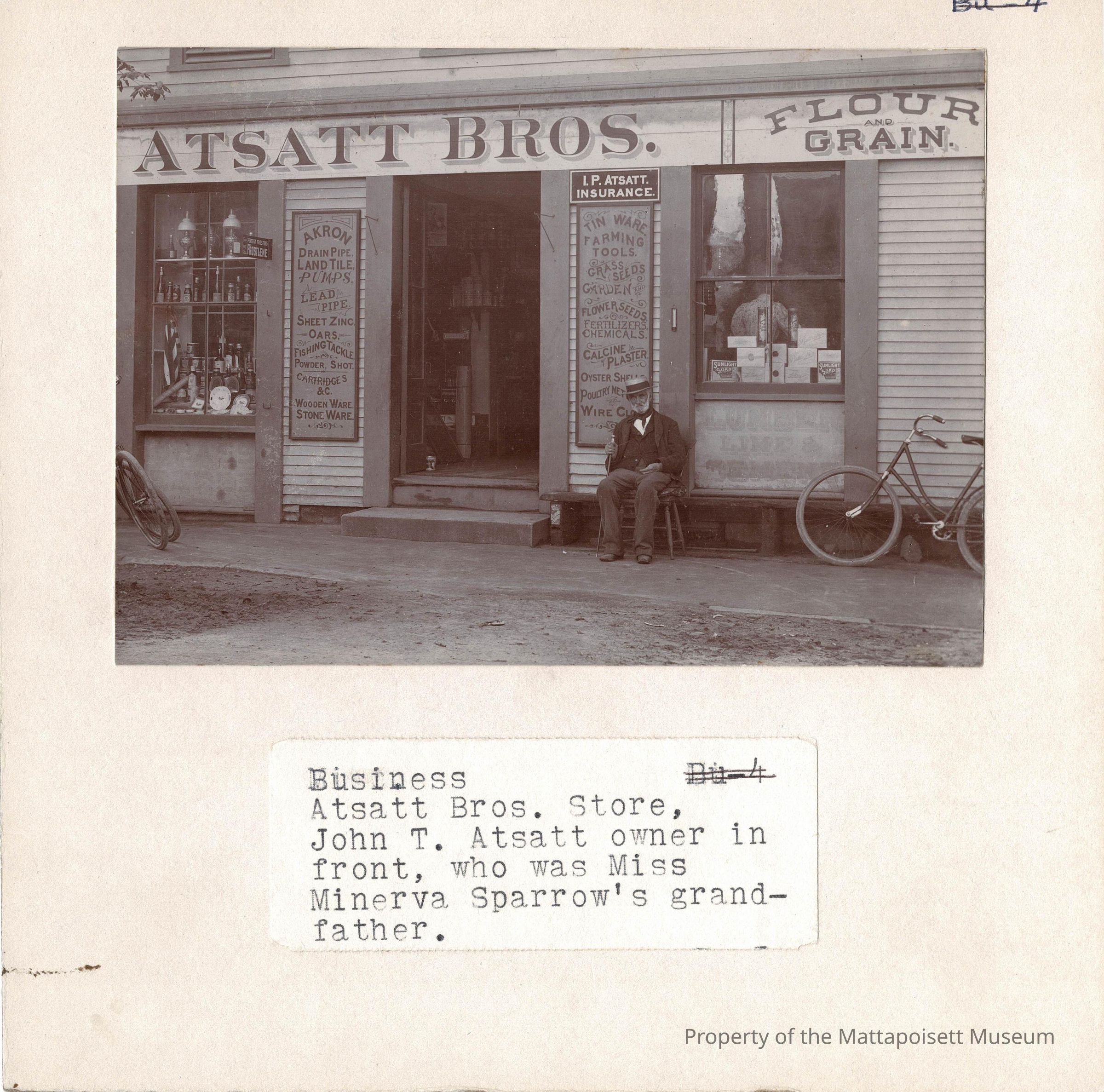 B&W photograph of the Atsatt Bros. store on Water Street, owner John T. Atsatt sitting in front.Collection