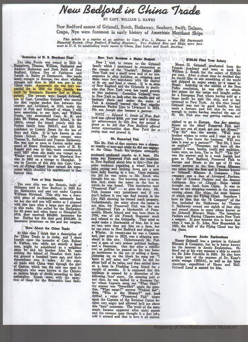 Photocopy of article "New Bedford in China Trade" by Capt. William L. Hawes. New Bedford names of Grinnell, Rotch, Hathaway, Seabury, Swift, Delano, Crapo, Nye were foremost in early history of American Merchant Ships.Collection