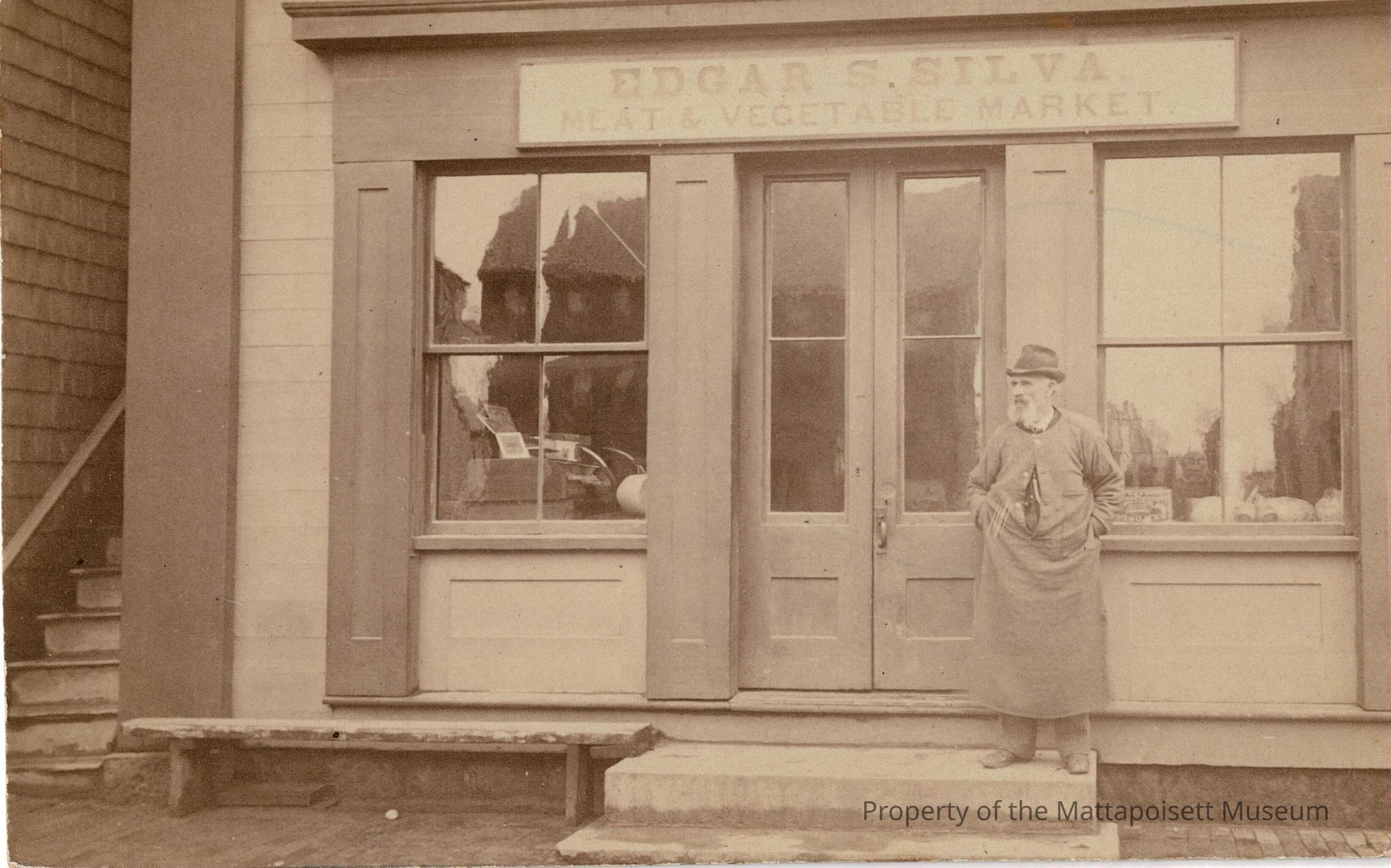 B&W photograph of Edgar Silva in front of his store on Water Street.Collection