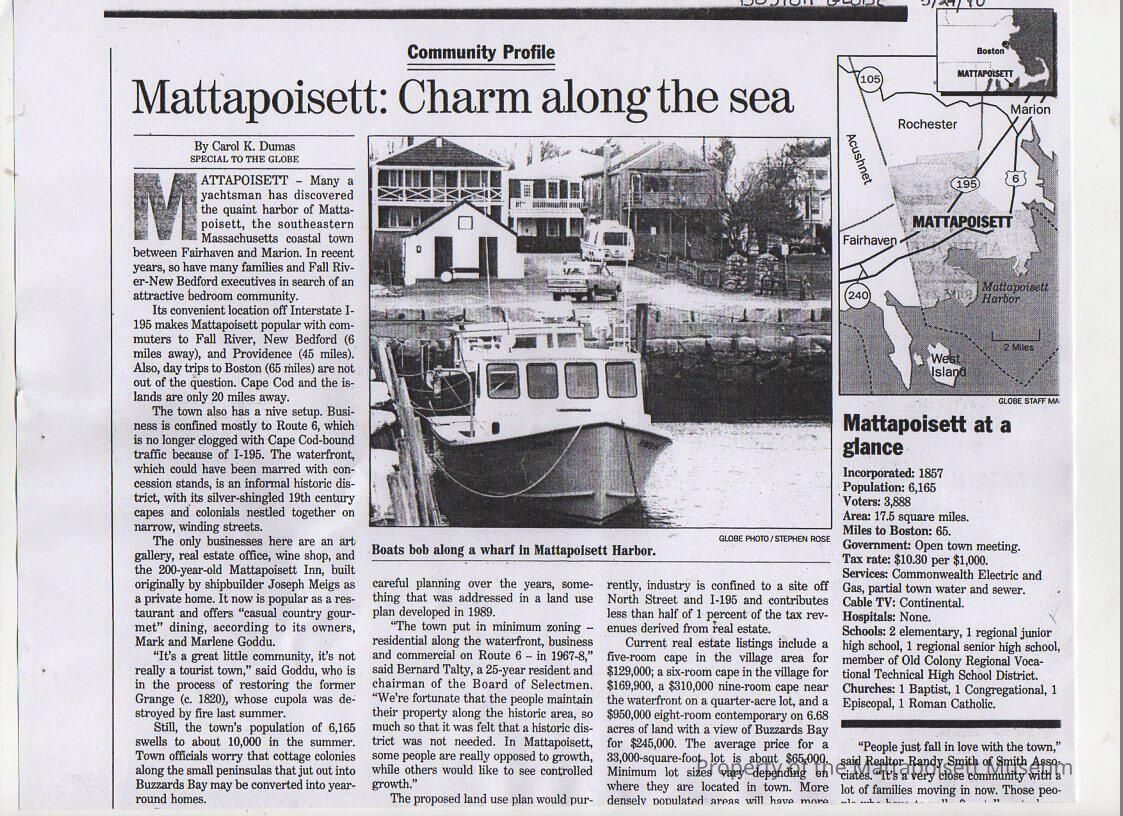 Photocopy of Boston Globe article "Mattapoisett: Charm along the sea". Community Profile.Collection
