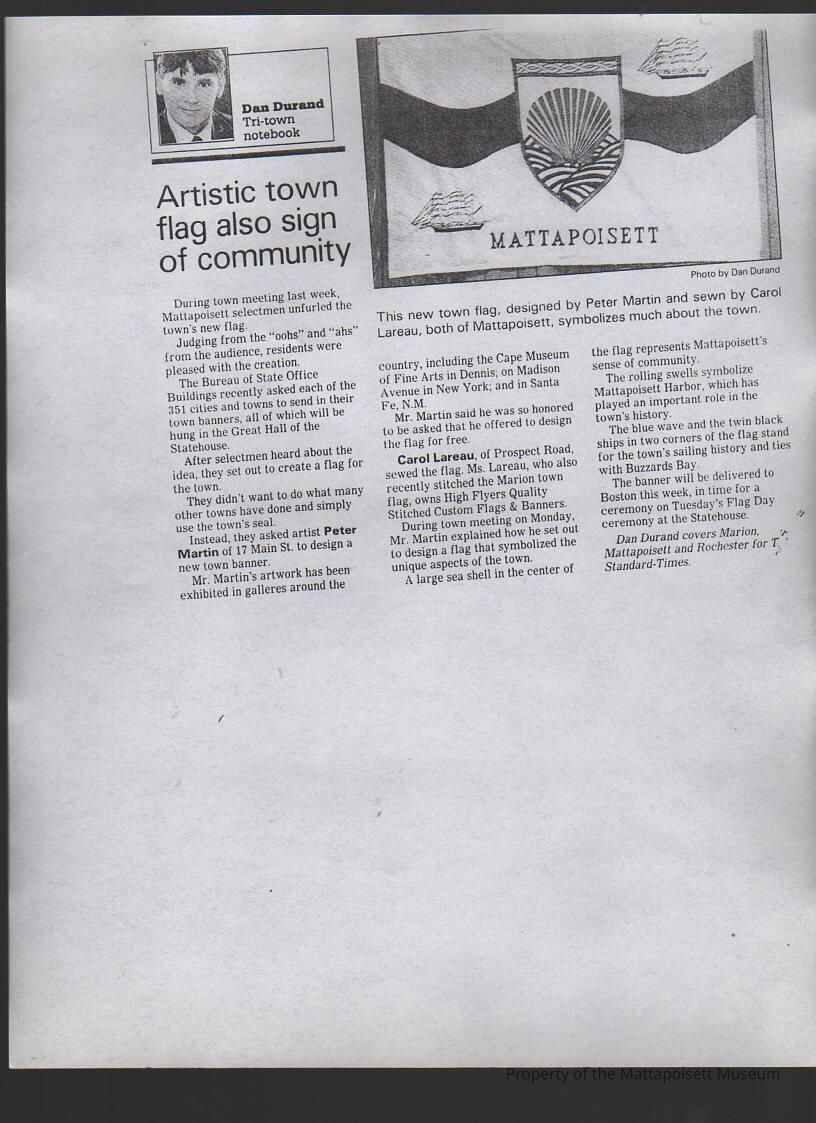 Photocopy of newspaper article "Artistic town flag also sign of community"Collection