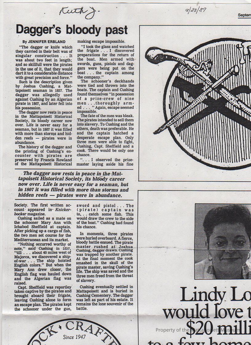 The history of the dagger and the printing of Cushing’s encounter with pirates are preserved by Francis Rowland of the Mattapoisett Historical
