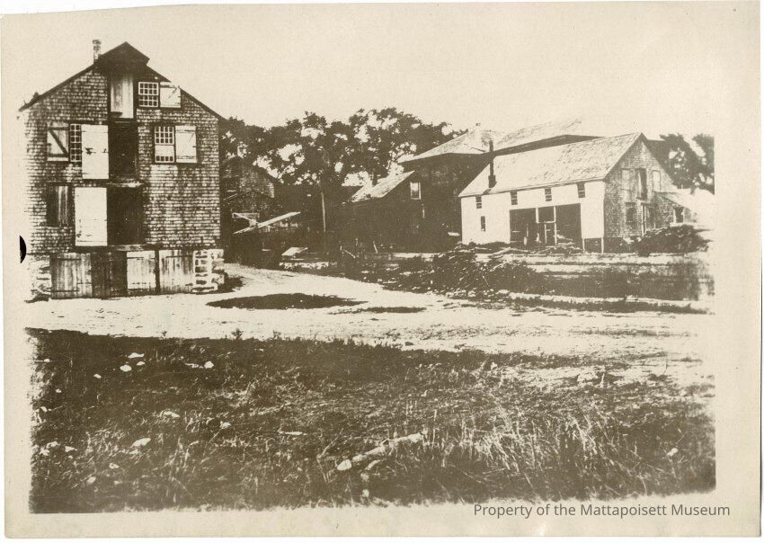 B&W photograph of a group on buildings on Water Street. From left to right: a sail loft, LeBaron's store & steambox, Romeo's, Purrington Hall, and Adison Curtis shop.Collection