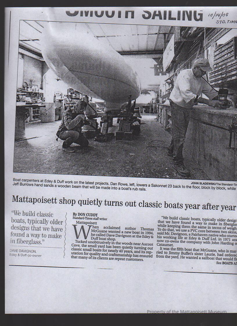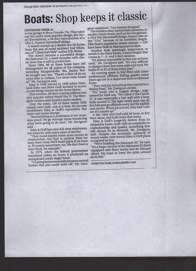 Photocopy of Standard-Times article "Mattapoisett shop quiet turns out class boats year after year.Collection