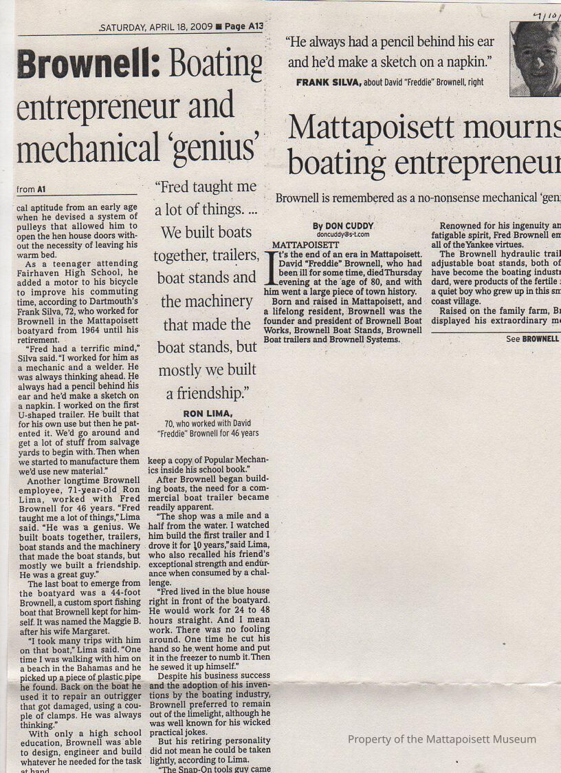 Standard-Times photocopy article "Mattapoisett mourns boating entrepreneur". Death of David "Freddie" Brownell.Collection