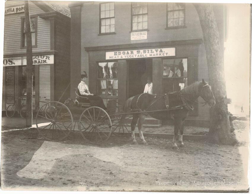 B&W photograph of Edgar Silva's store on Water Street. Mr. Silva standing in the door way, and his daughter Lizzie is in the carriage.Collection