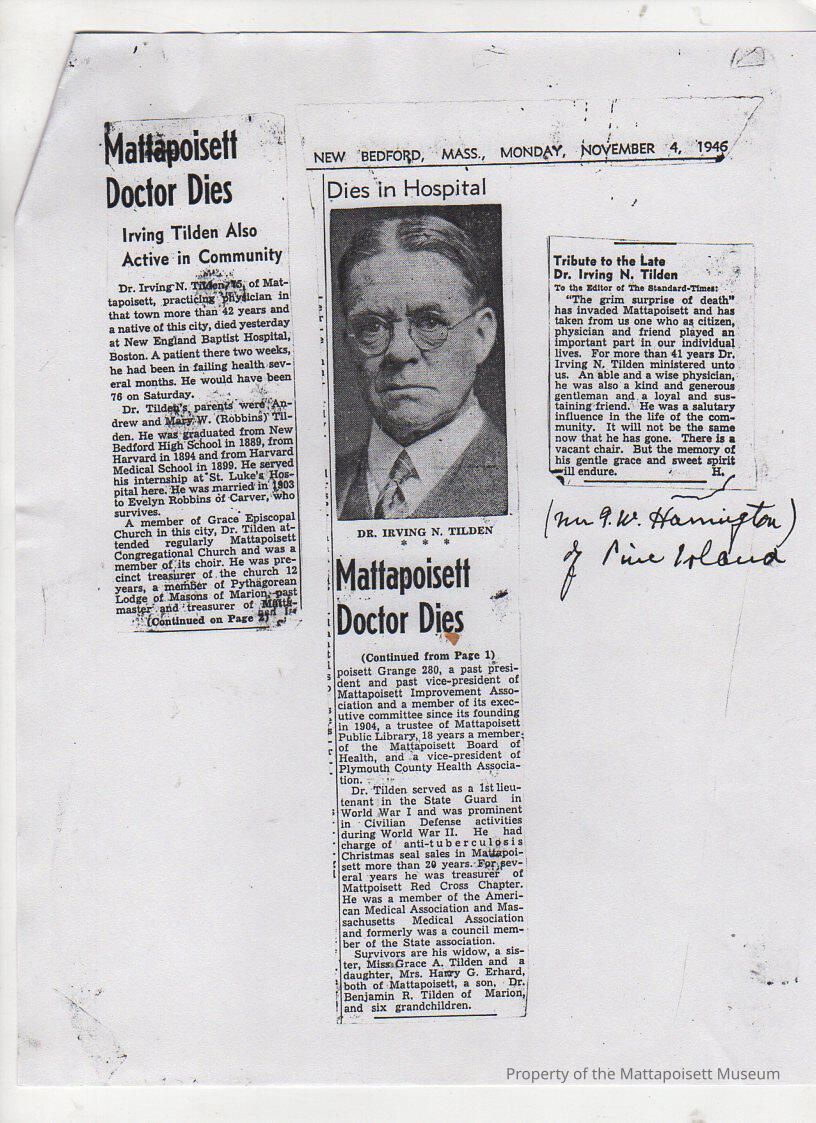 Standard-Times photocopy article and obituary for Dr. Irving N. Tilden. "Mattapoisett Doctor Dies"Collection