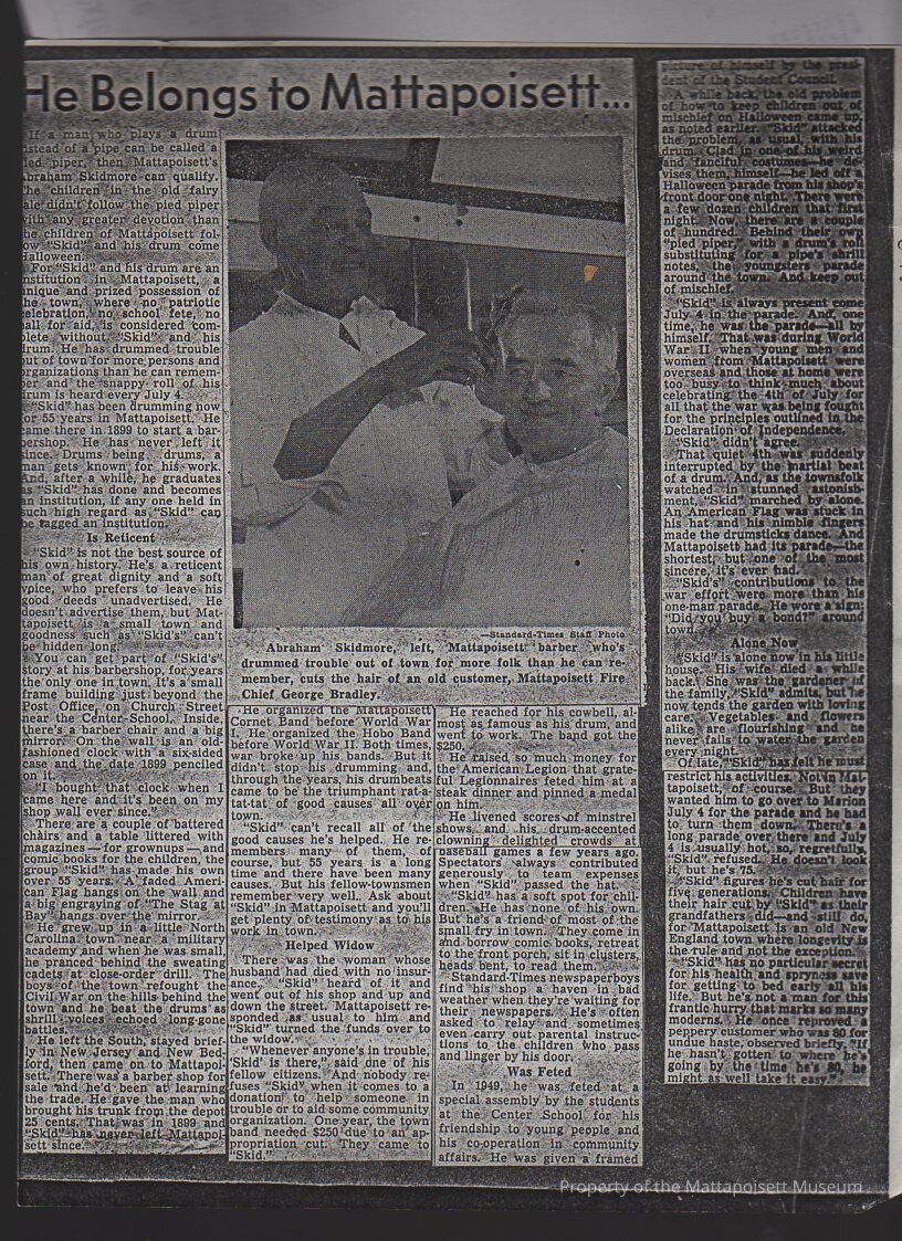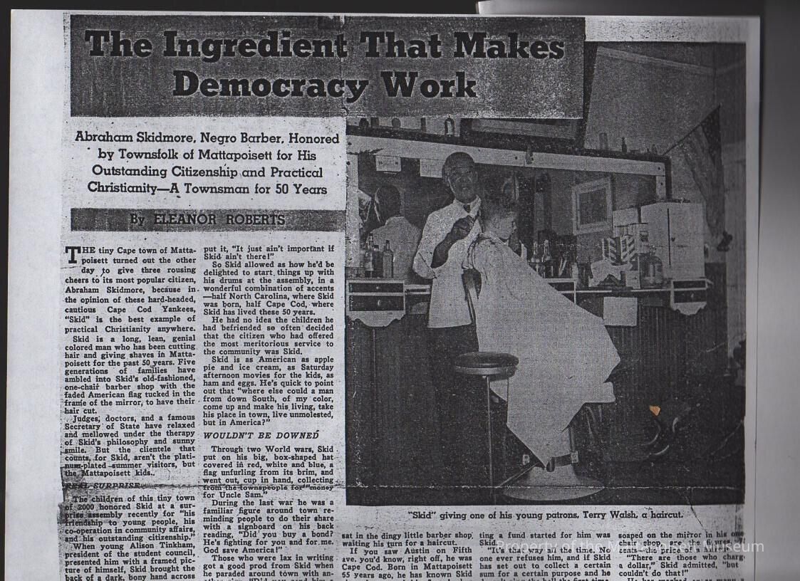 Newspaper photocopy of article "The Ingredient that Makes Democracy Work", Abraham Skidmore, Negro Barer, Honored by Townsfolk of Mattapoisett for His Outstanding Citizenship and Practical Christianity - A Townsman for 50 years.Collection