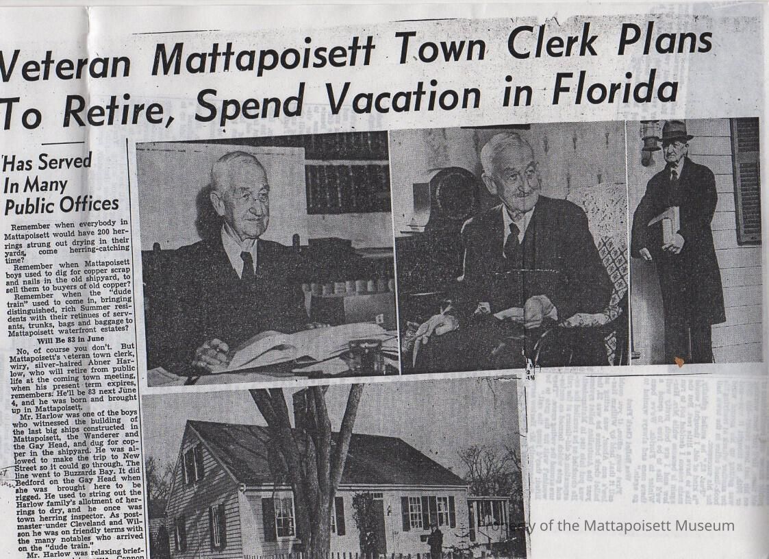 Newspaper photocopy of article "Veteran Mattapoisett Town Clerk Plans to Retire, Spend Vacation in Florida" Has served in many public offices. 83-year-old Abner Harlow retires.Collection