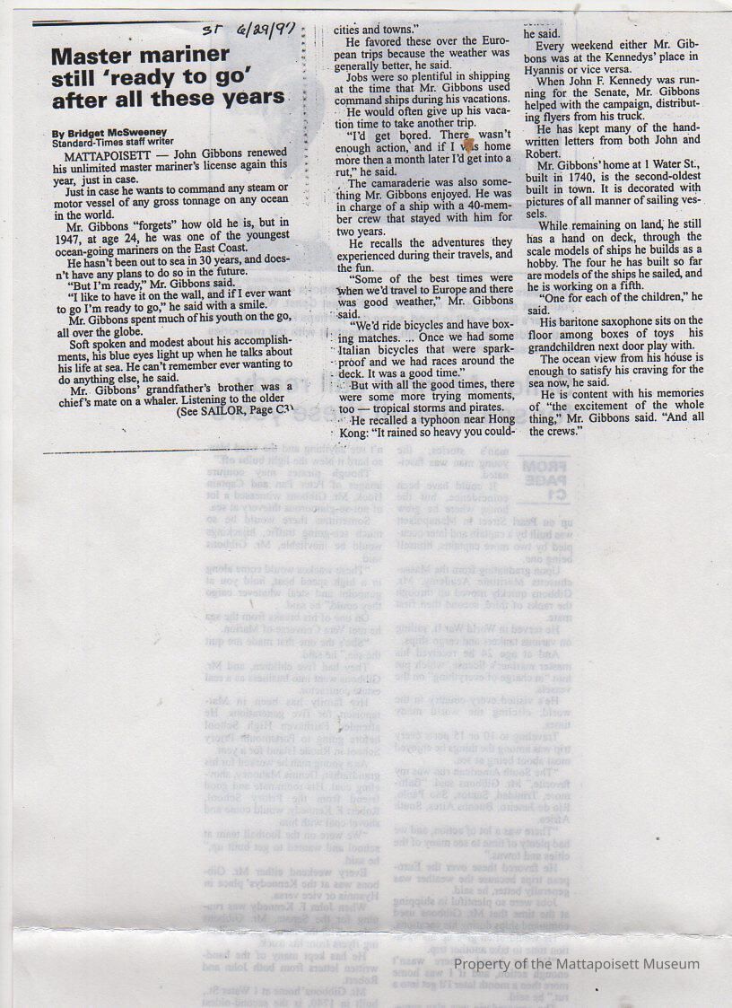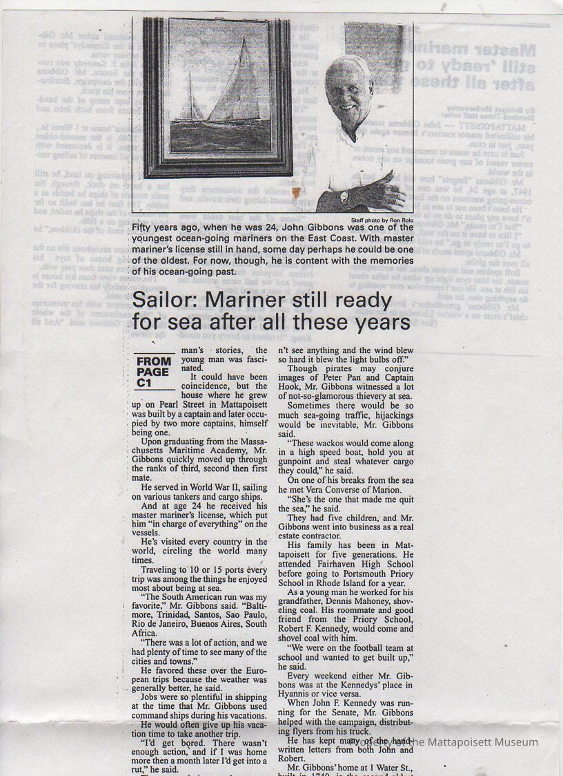 Standard-Times photocopy of article "Master Mariner still 'ready to go' after all these years". John Gibbons renewed 'unlimited master mariner's license'.Collection