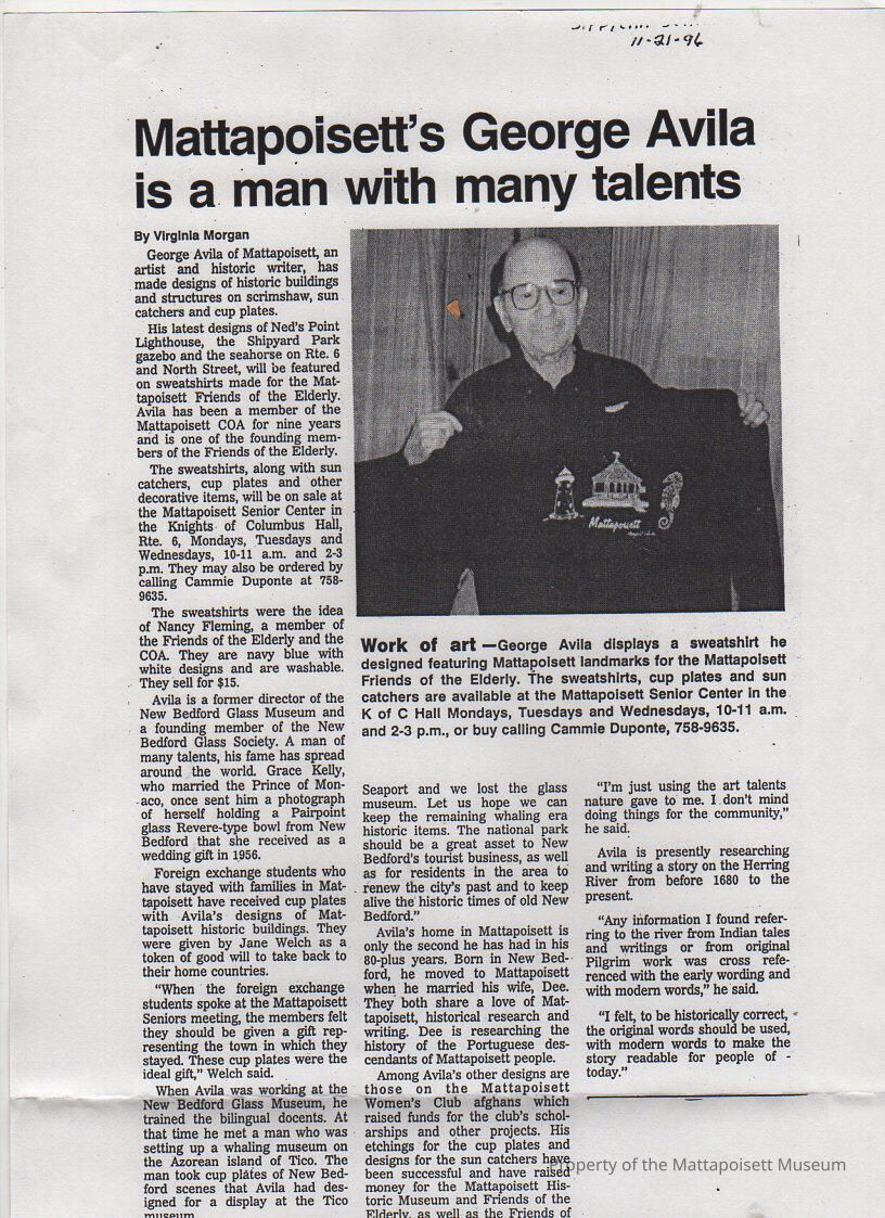 Newspaper photocopy of article "Mattapoisett's George Avila is a man with many talents", artist and historic writer, has made designs of historic buildings and structures on scrimshaw, sun catchers and cup plates.Collection