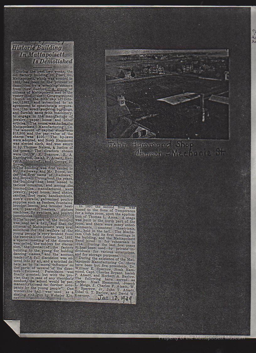 Newspaper photocopy of article "Historic Building in Mattapoisett is Demolished". Mattapoisett Manufacturing Co. (Dancing, Sparrow, Hammond, Bryant, Atsatt, Barlow)Collection