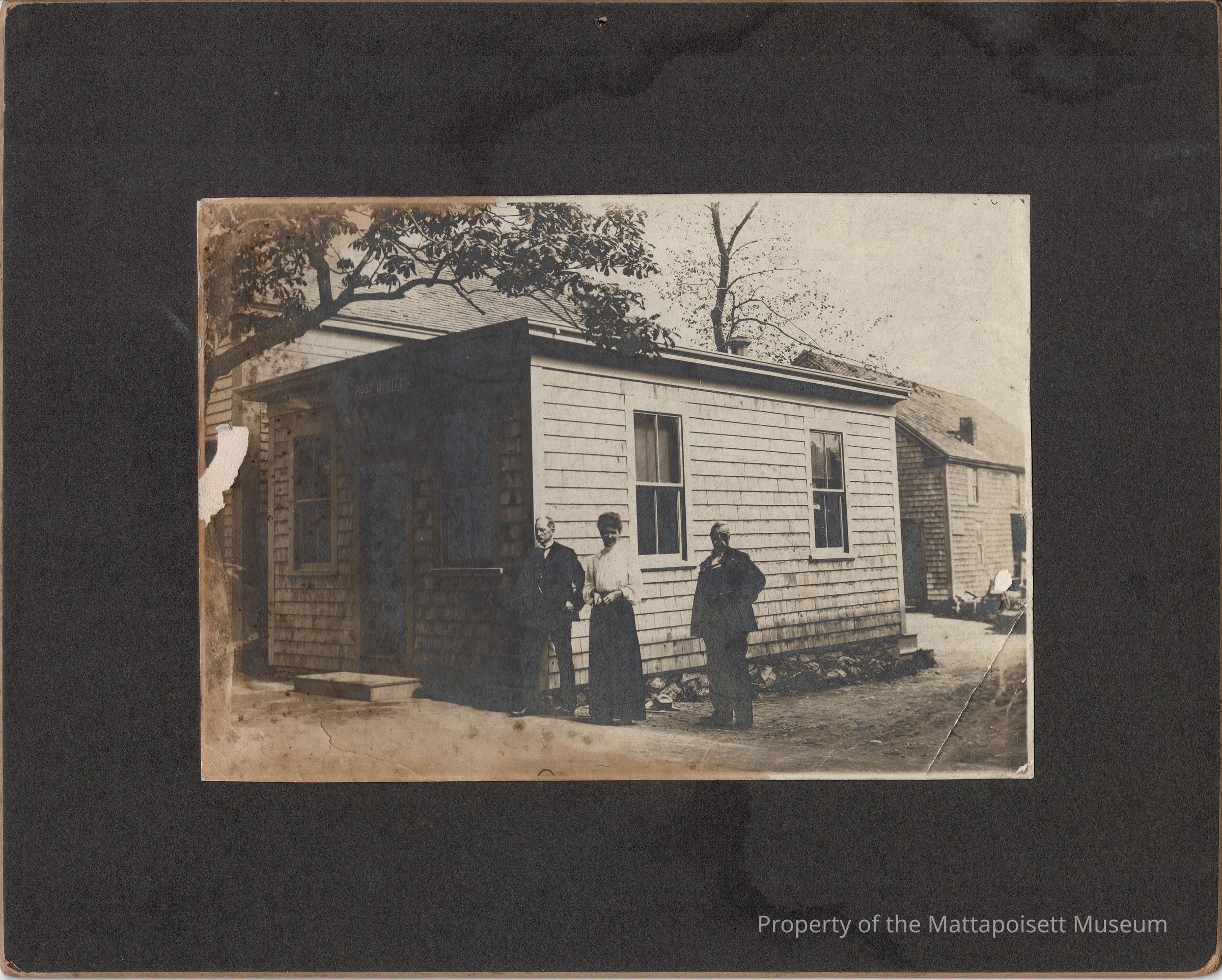 B&W photograph of the Mattapoisett post office on Water Street. Left to right: Postmaster James S. Burbank, assistant Sarah E. Hammond, carrier James Jay.Collection