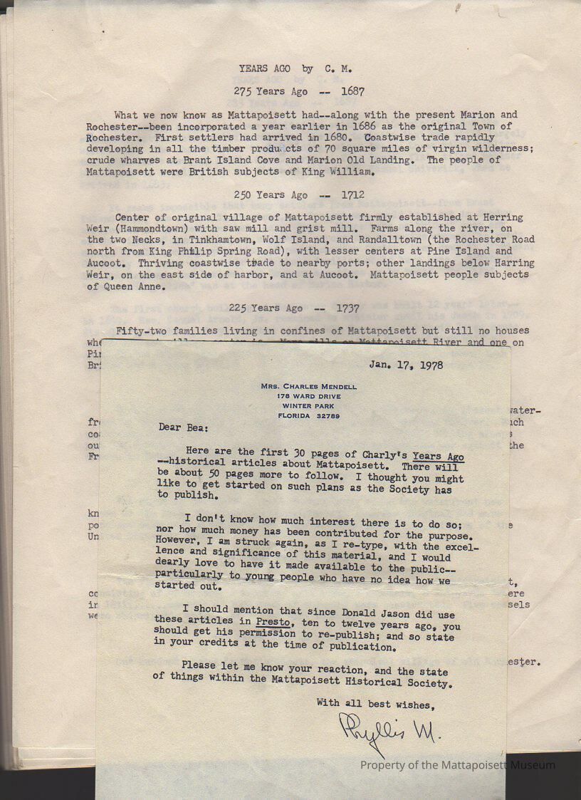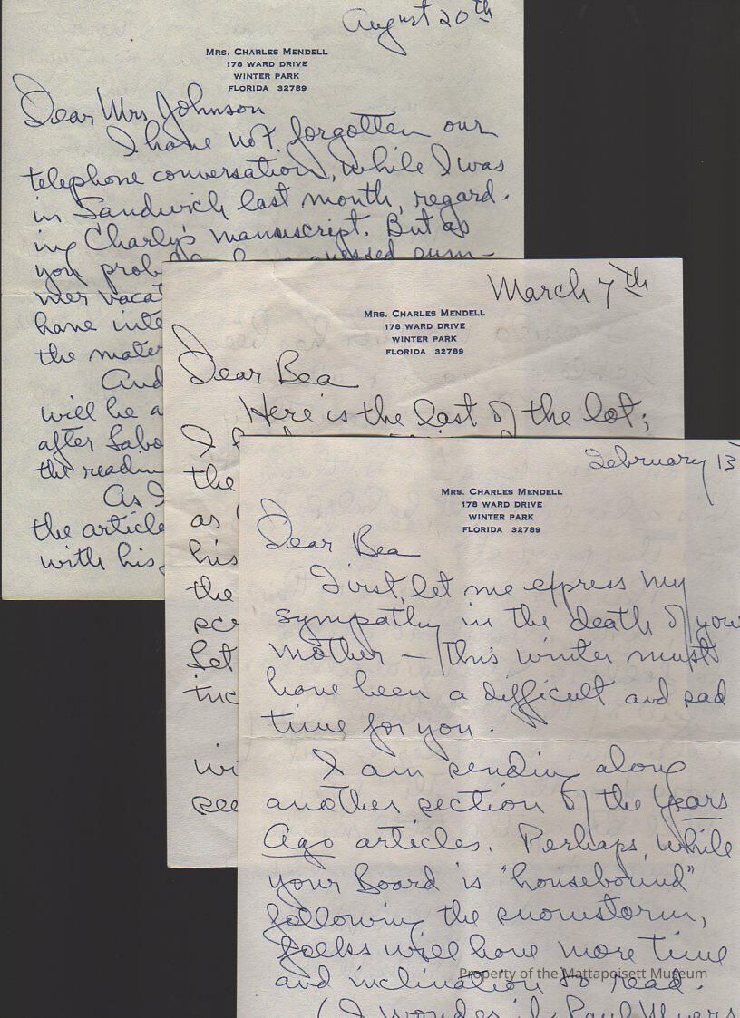 Letters to Bea Johnson from Mrs. Charles (Phyllis) Mendell.Collection