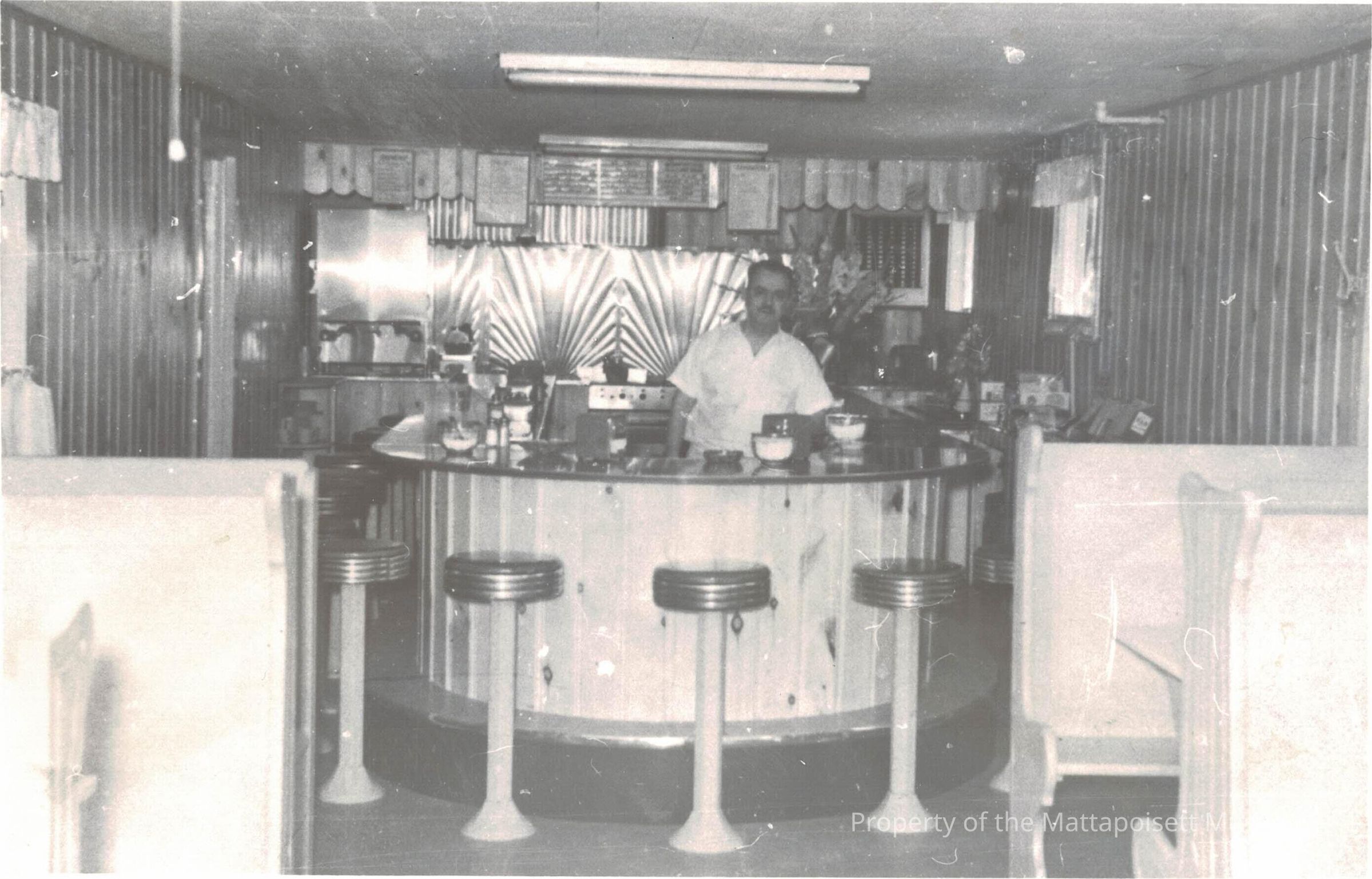 B&W photograph of interior of Joe's PX on Church Street, next to Center School, c. 1964. Tony Secia at the counter.Collection