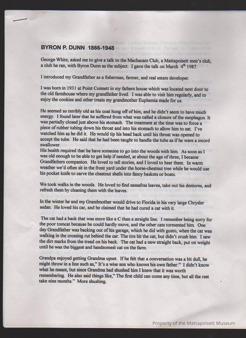 Recollections of someone about Byron P. Dunn in a talk at Machacam Club, 1866-1948Collection