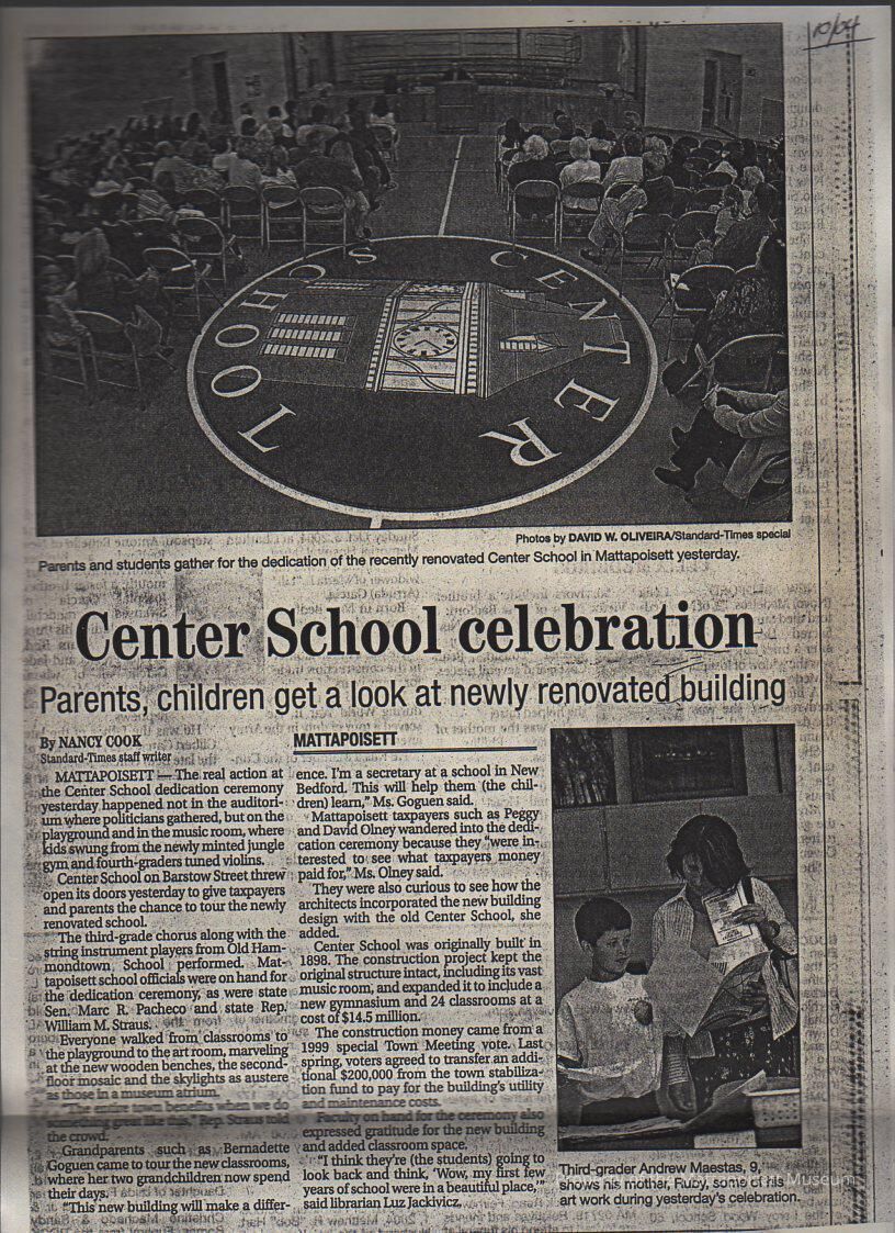 Standard-Times photocopy of article "Center School celebration" Parents, children get a look at newly renovated building.Collection