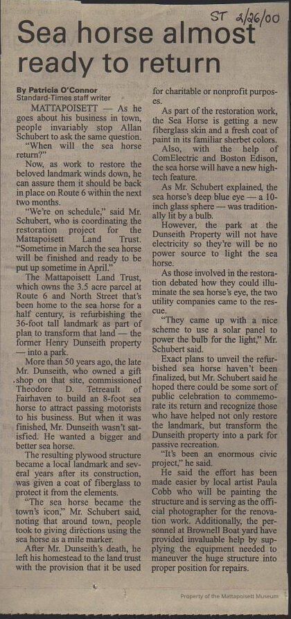 Standard-Times article "Sea horse almost ready to return"Collection