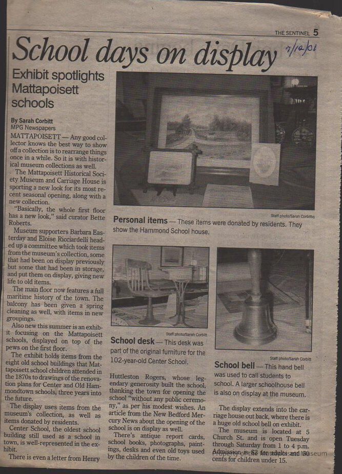 The Sentinel article "School days on display" Exhibit spotlights Mattapoisett Schools. Exhibit at Mattapoisett Historical Society Museum & Carriage House.Collection