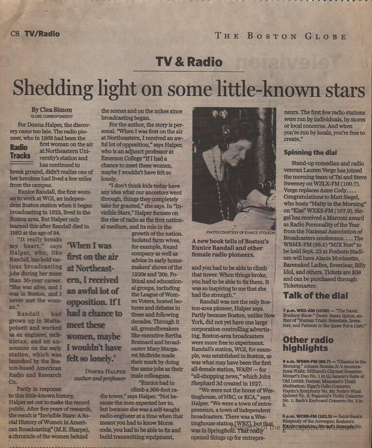 Boston Globe article "Shedding light on some little-known stars", Eunice Randall, the first woman at WGI, a Boston independent radio station, started in 1922, grew up in Mattapoisett.Collection