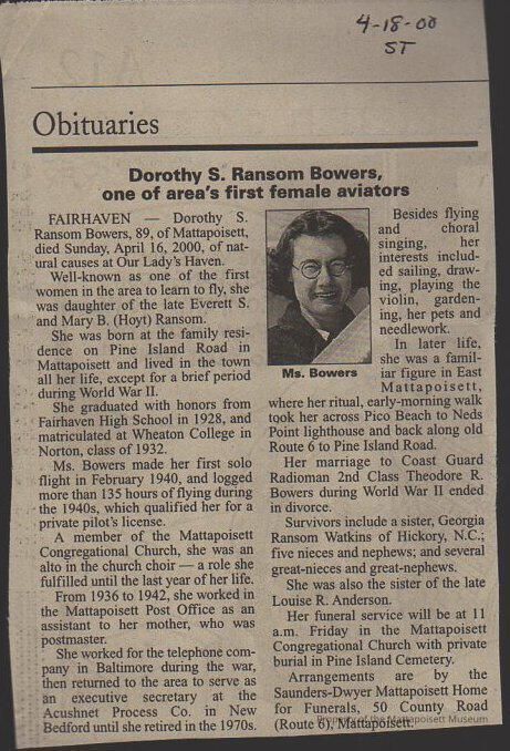 Standard-Times obituary "Dorothy S. Ransom Bowers, one of area's first female aviators".Collection