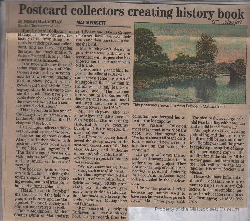 Standard-Times article "Postcard collectors creating history book" A Picture Postcard History of Mattapoisett, Massachusetts, idea of Natalie Sylvia-Hemingway. (see 0500.2.719)Collection