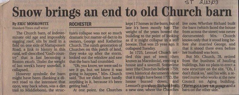 Standard-Times article "Snow brings an end to old Church barn" Built on land settled by Lemuel Church in 1725.Collection