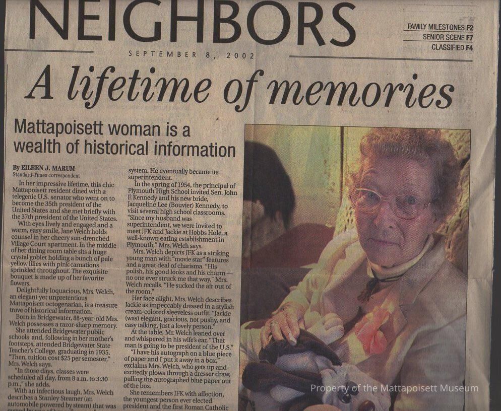Standard-Times article "A lifetime of Memories" Mattapoisett woman (Jane Welch) is a wealth of historical information.Collection