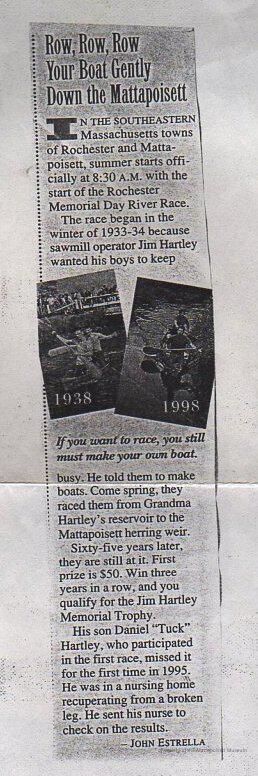 Newspaper photocopy of article "Row, Row, Row your boat gently down the Mattapoisett" Rochester Memorial Day River Race, started 1934.Collection