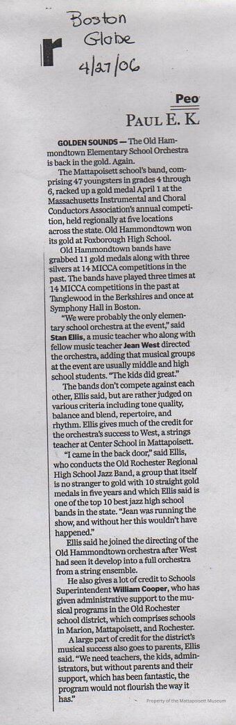 Boston Globe photocopy of article "Golden Sounds" The Old Hammondtown Elementary School Orchestra won gold medal at Massachusetts Instrumental and Choral Conductors Association annual competition.Collection