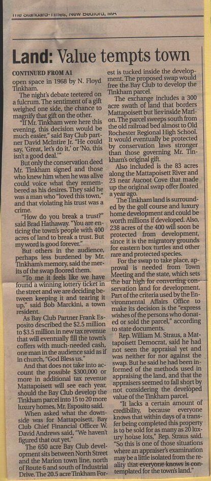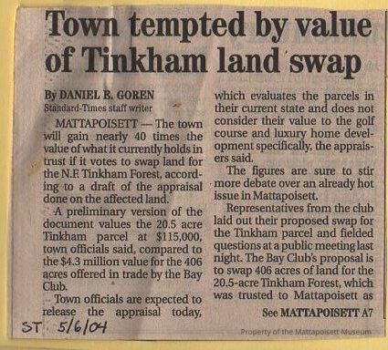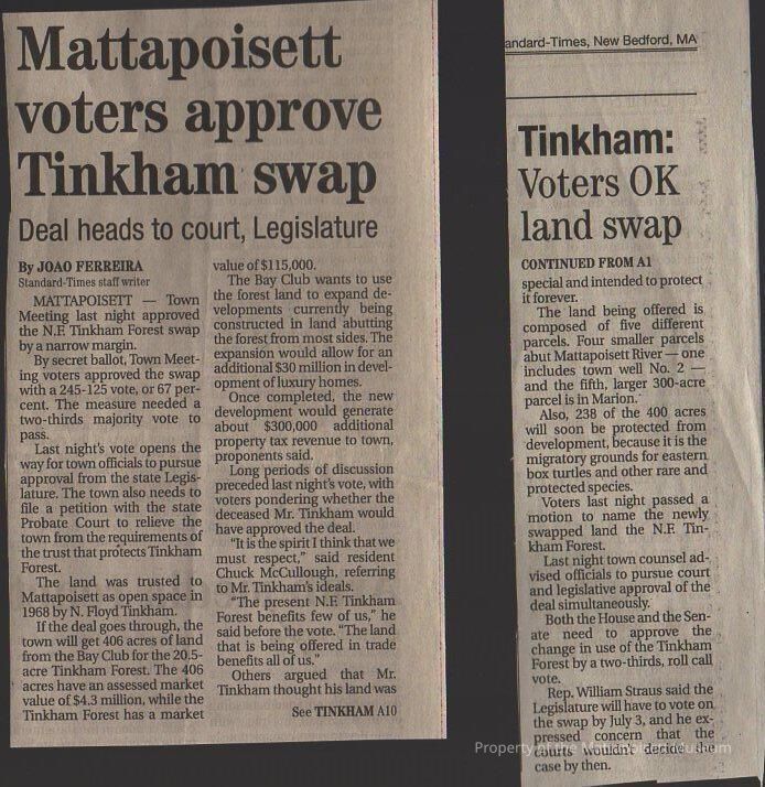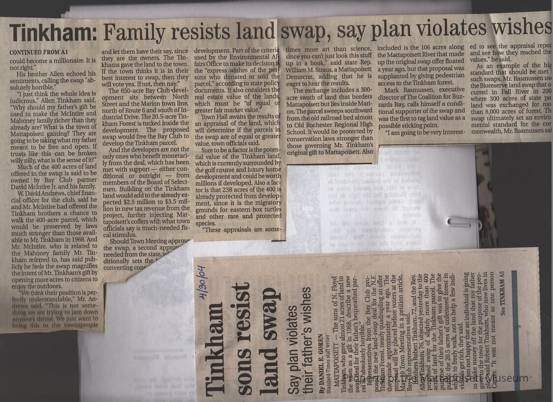 Newspaper articles "Mattapoisett voters approve Tinkham swap" Deal heads to court, Legislature and "Tinkham sons resist land swap, say plan violates wishes" (04/30/2004).Collection