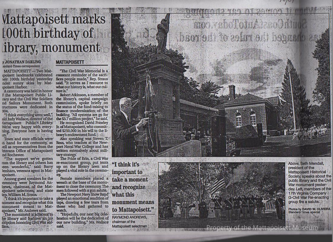 Standard-Times photocopy of article "Mattapoisett marks 100th birthday of library, monument" Mattapoisett Public Library and Civil War Soldiers and Sailors Monument celebrate 100th "birthday".Collection