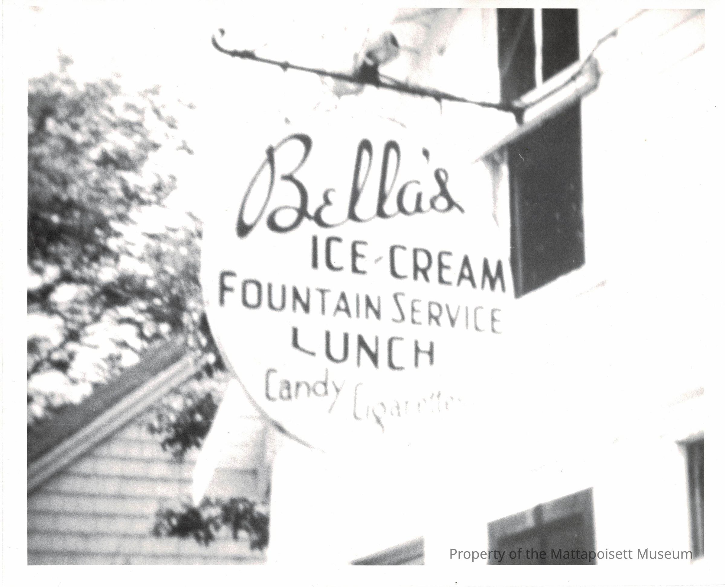 B&W photograph of Bella's Ice Cream, on the corner of Church and Mechanic Streets.Collection