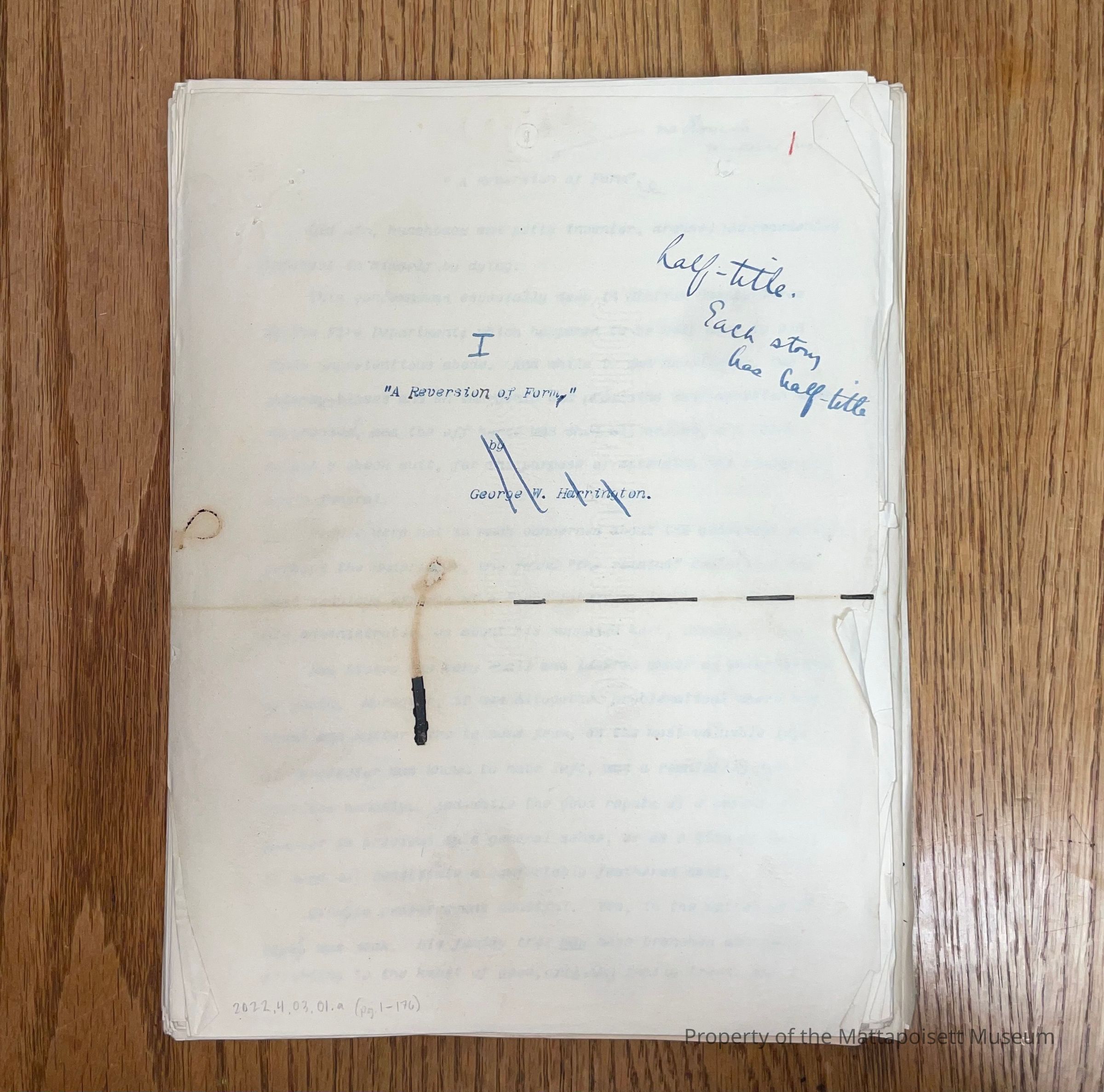 Harrington is a published author who spent his summers writing in Mattapoisett. The first book he published was a short story collection about horses called "A Reversion of Form" in 1911. 2022.4.03 is the manuscript series.Collection