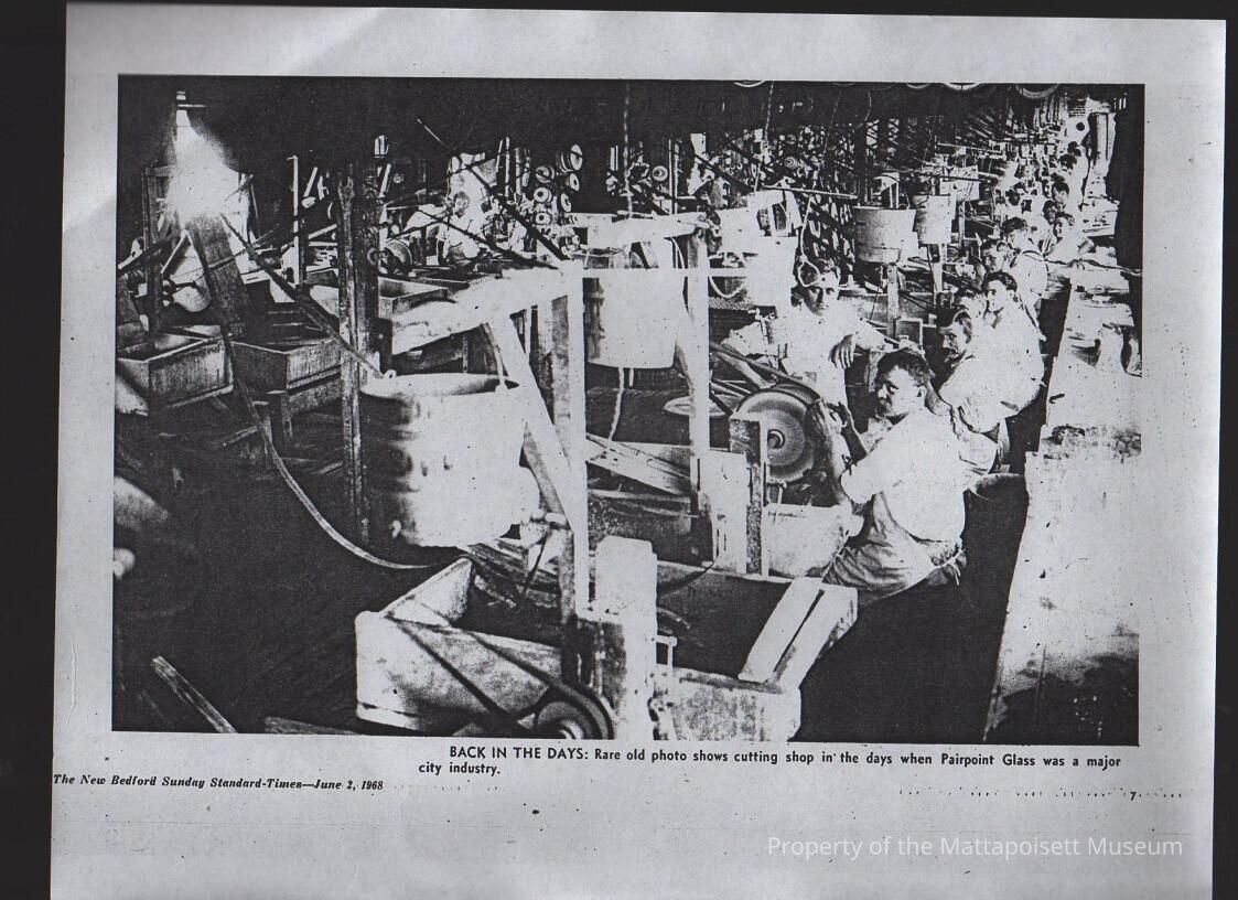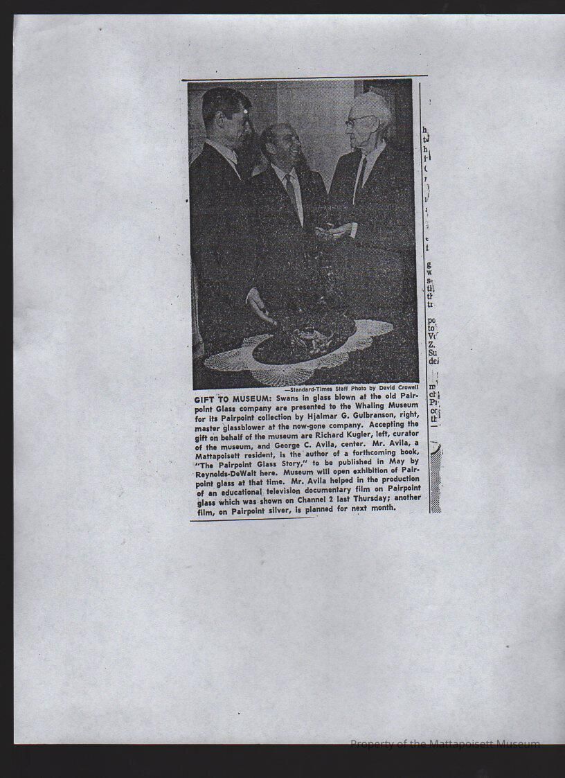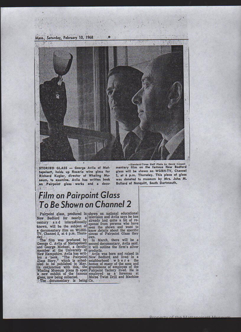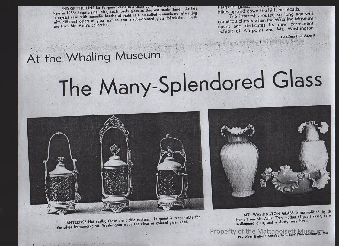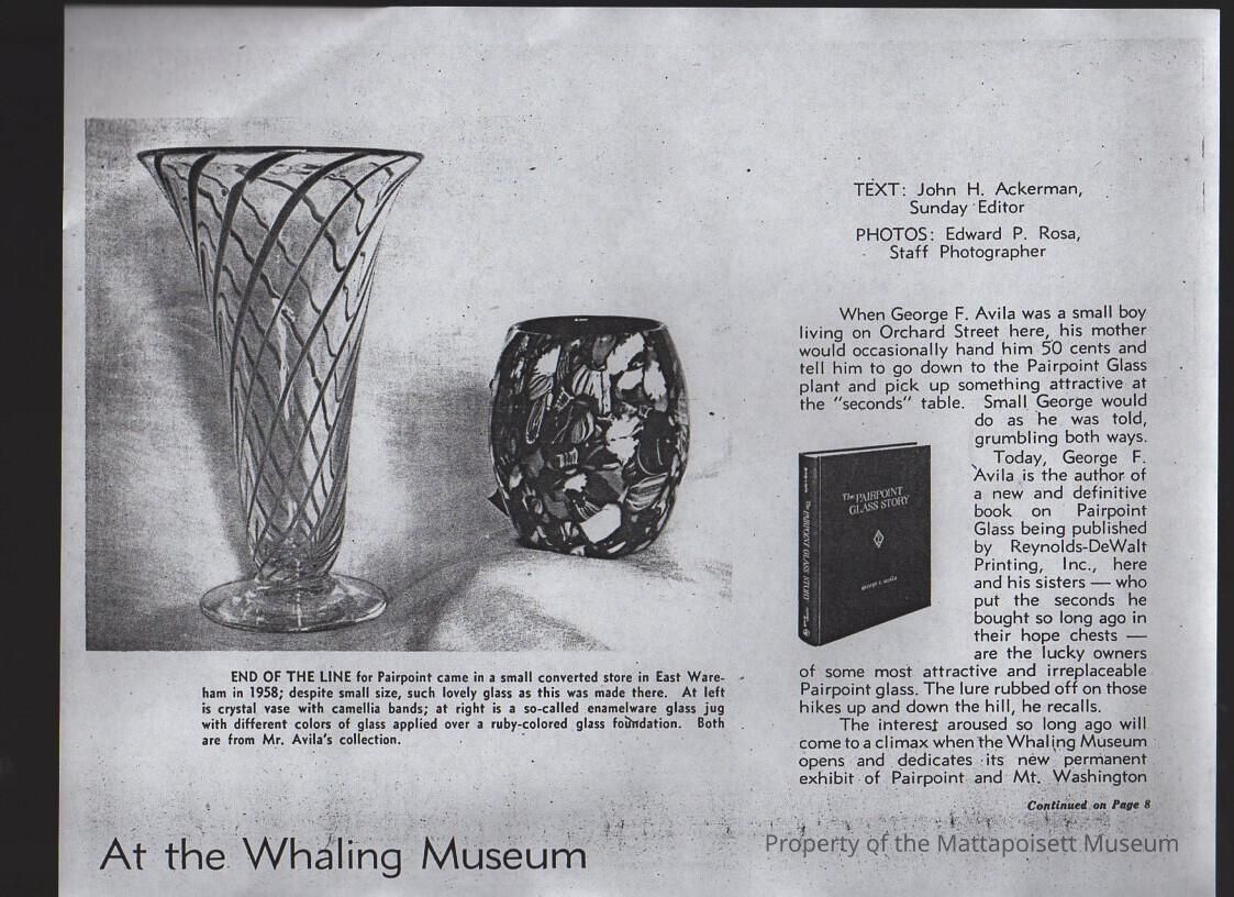 Standard-Times articles "At the Whaling Museum: The Many-Splendored Glass" and "Film on Pairpoint Glass to be Shown on Channel 2", Pairpoint glass, Mt. Washington glass, cutting shop. Book written by Mattapoisett resident George C. Avila on "The Pairpoint Glass Story".Collection