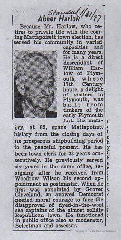 Standard-Times article "Abner Harlow", Town Clerk, Postmaster, moderator, Selectman and assessor of Mattapoisett.Collection