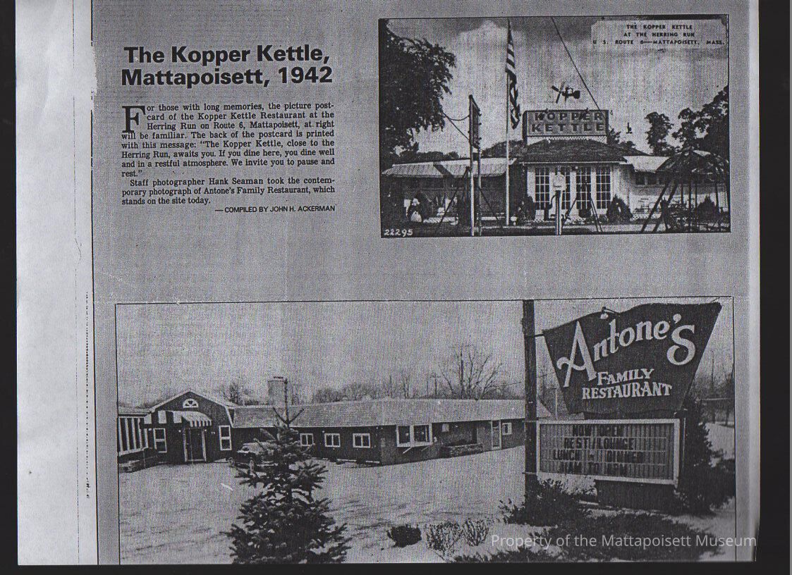 Newspaper article "The Kopper Kettle, Mattapoisett, 1942, restaurant on Route 6 at Herring Run. Later Antone's Family Restaurant.Collection
