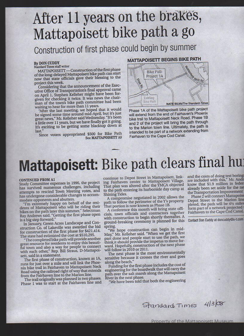 Standard-Times photocopy of article "After 11 years on the brakes, Mattappoisett bike path a go" Construction of first phase could begin by summer.Collection