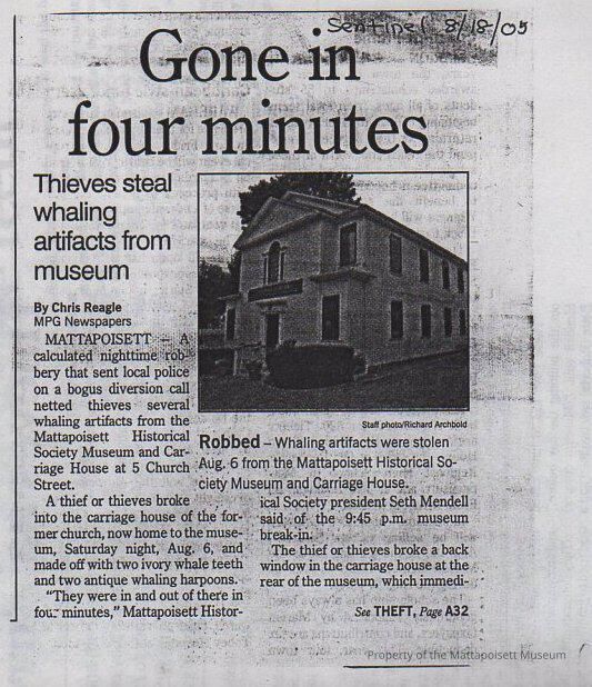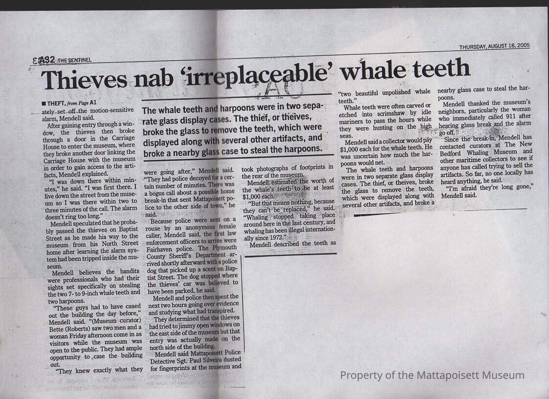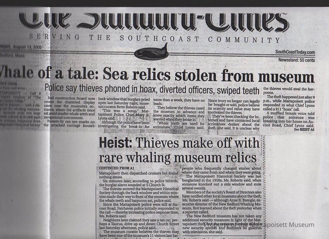 Sentinel and Standard-Times photocopies of articles "Gone in four minutes" Thieves steal whaling artifacts from museum and "Whale of a tale: Sea relics stolen from museum" Police say thieves phoned in hoax, diverted officers, swiped teeth.Collection