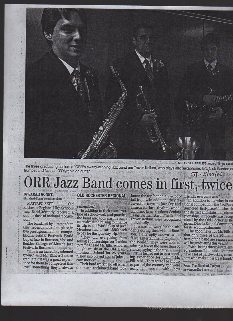 Standard-Times photocopy of article "ORR Jazz Band comes in first, twice". Old Rochester Regional High School's Jazz Band took first place with FAME Festival's World Cup of Jazz and Berklee College of Music's Jazz Festival in Boston.Collection