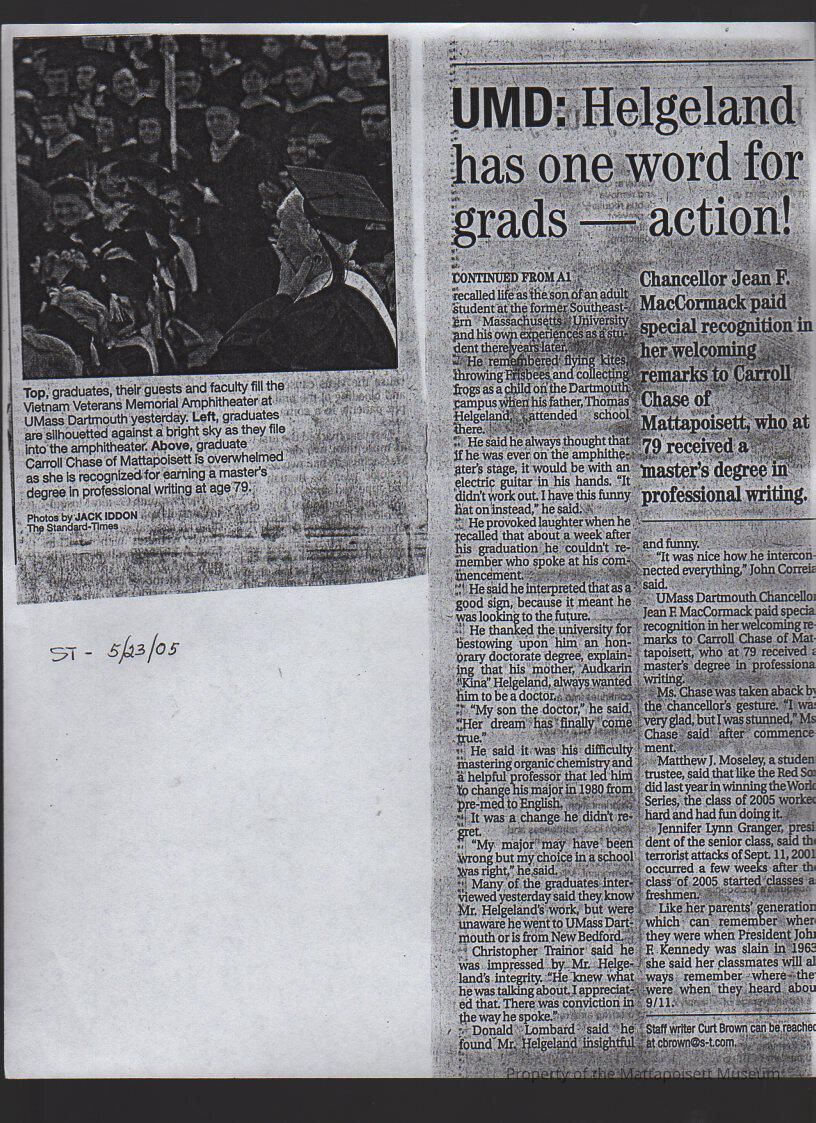 Standard-Times photocopy of article "UMD: Helgeland has one word for grads - action!" Chancellor Jean F. MacCormack paid special recognition in her welcoming remarks to Carroll Chase of Mattapoisett, who at 79 received a master's degree in professional writing.Collection